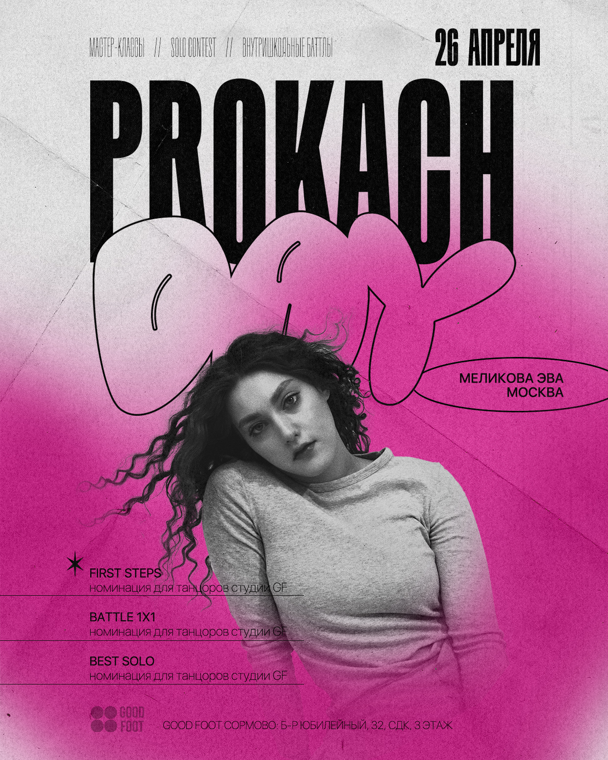 PROKACH DAY - Это мастер-классы по хореографии для начинающих и продолжающих танцоров. Внутришкольные баттлы и solo contest для учеников танцевальной студии GOOD FOOT.